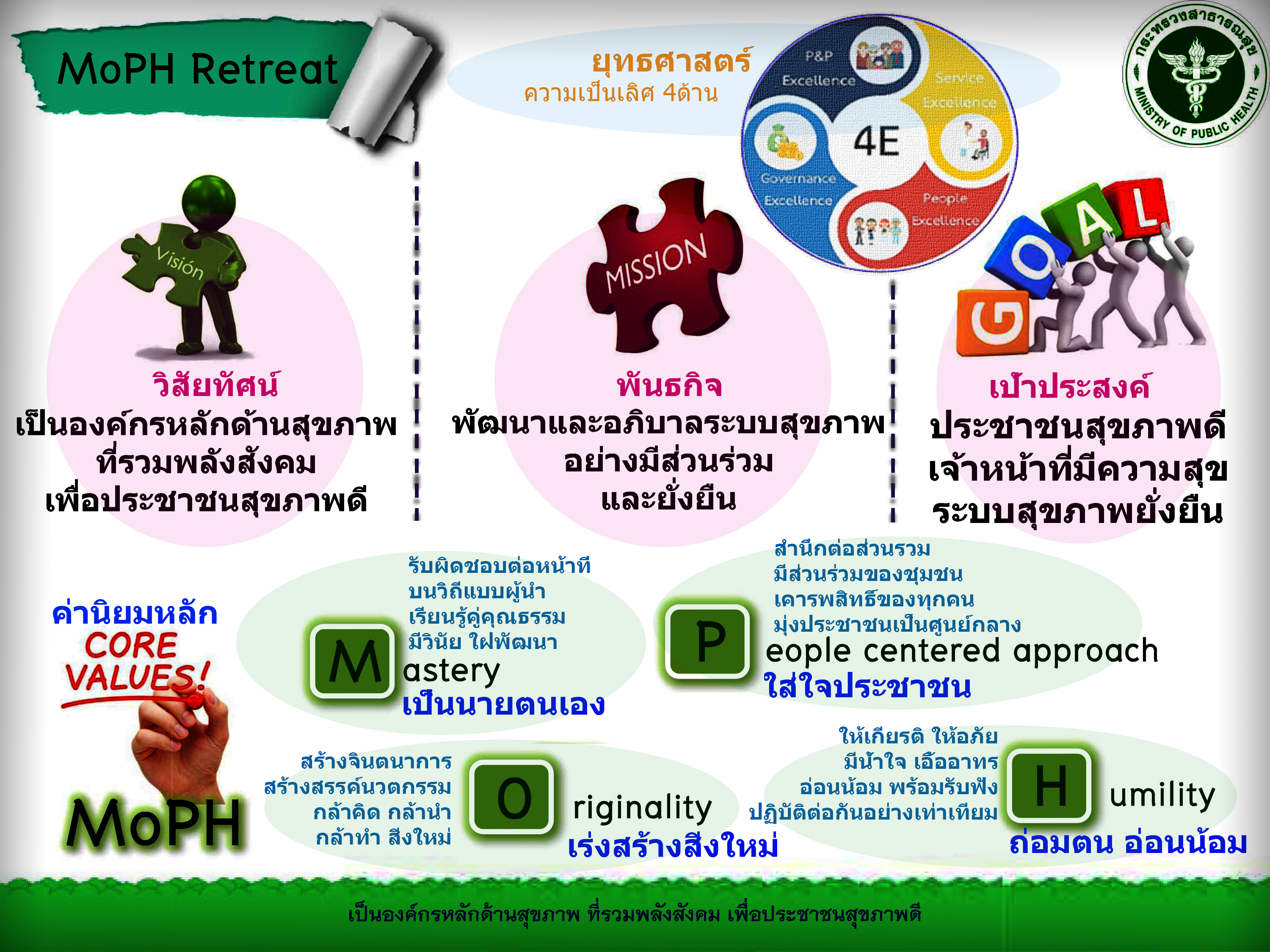 Excellence) รวมทั้ง 15 แผนงาน 40 โครงการ และ 75 ตัวชี้วัด เพื่อสร้างความเขาใจร่วมกันในการดำเนินงานด้านสาธารณสุข